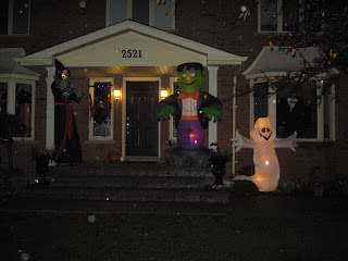 It was a dark at somewhat rainy night but the boys and their friends (the Campbell's, the Sherren's and Curtis' classmate-Sam) still managed to find plenty of candy when they were out.  Our back yard was part swamp so our decorations were confined to indoors and a few blow-ups in the front of the house.  The boys even worked on a smaller version of a haunted house for their friends in the basement.